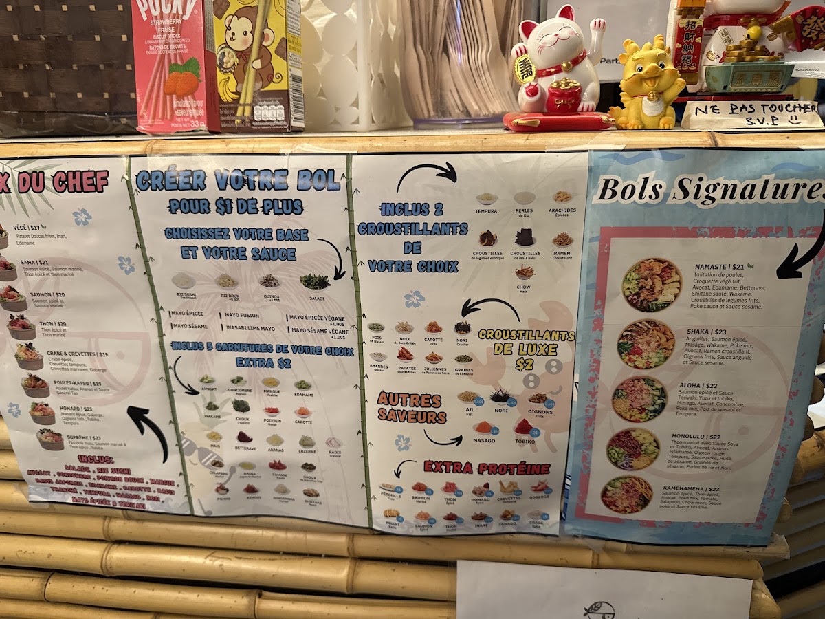 Le Poké Station Masson offers a diverse and vibrant menu, featuring a variety of poke bowls and appetizers that cater to different tastes. For those who prefer to customize their dish, there are options like the Custom Poulet Katsu (Katsu Chicken), Custom Végé (Veggie), Custom Crabe & Crevettes (Crab & Shrimp), and Custom Supreme. These bowls allow you to create your ideal combination, with prices varying based on choice. For a lighter option, their Entrées include tasty choices like Crevettes Tempura (Tempura Shrimp), Haru Makis (Spring Rolls), and a refreshing Salade Wakame (Seaweed Salad). For those with kids, the Bol Enfant options, such as the Enfant - Chef Config. Poulet Katsu or Enfant - Chef Config. Végé, provide smaller portions with a fun twist. Signature bowls like NAMASTE, HONOLULU, and ALOHAKAMEHAMEHA bring a taste of tropical flavors to your meal, while gluten-friendly options like Végé Gluten-Friendly and Aloha Gluten-Friendly ensure everyone can enjoy a delicious bowl. Don't forget to add an extra sauce like Mayo Wasabi Lime or SrirachaMayo Epicee to elevate your poke experience. To finish your meal, treat yourself to a sweet snack like Sesame Balls (6 pieces). With a wide variety of combinations and a focus on fresh ingredients, Le Poké Station Masson offers a delightful experience for poke lovers of all ages.