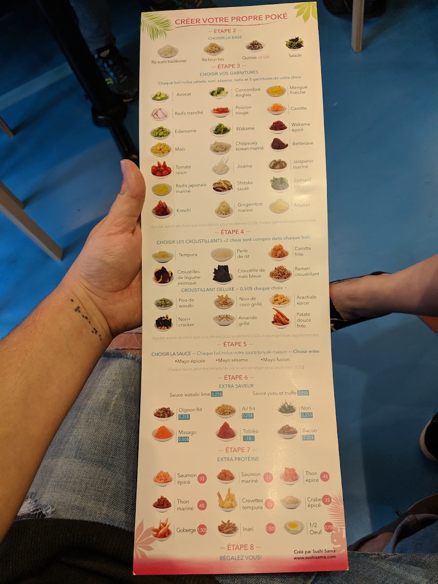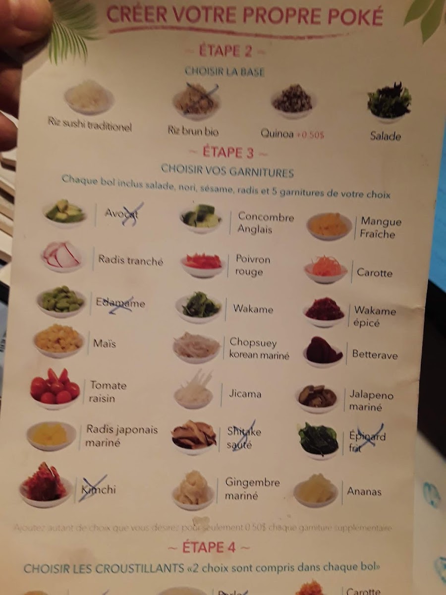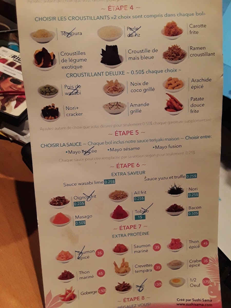 carrotte • avocat • concombre anglais • poivron rouge • mangue frais • radis japonais mariné • tempura • perles de riz • masago • nori • sesame • sauce teriyaki • mayo épicé // carrot • avocado • english cucumber • red pepper • fresh mango • oshinko • edamame • tempura • rice beads • masago • nori • sesame • teriyaki sauce • spicy mayo